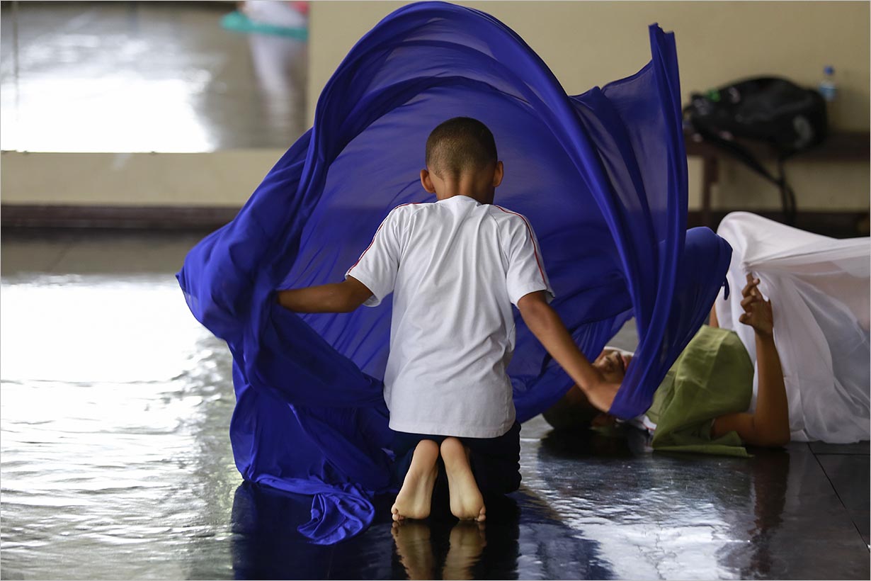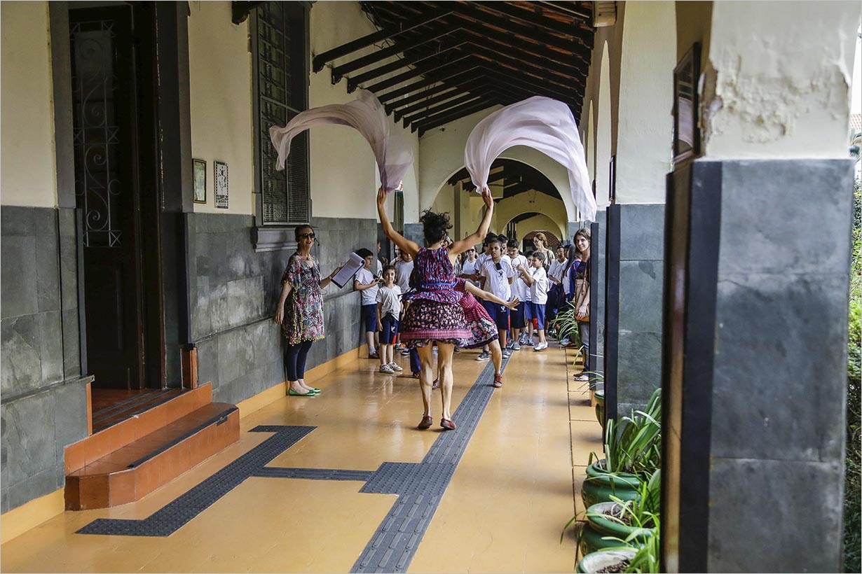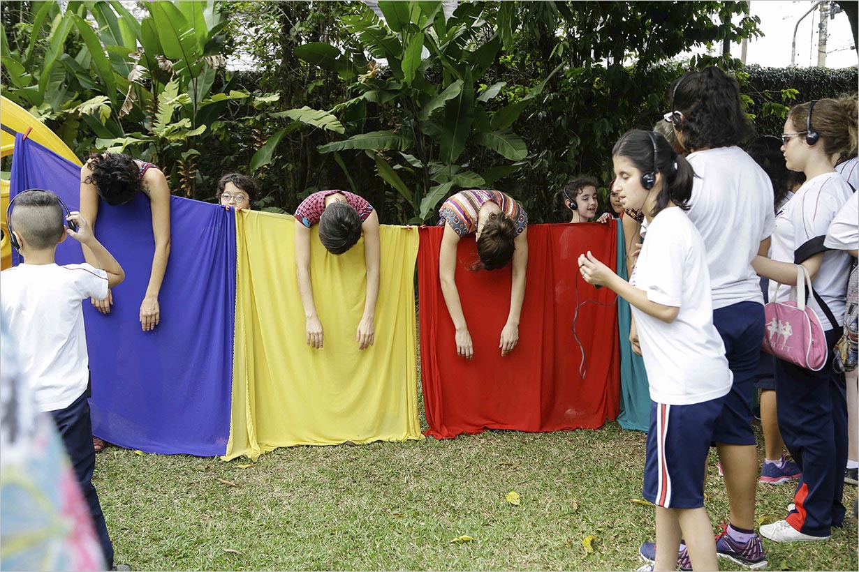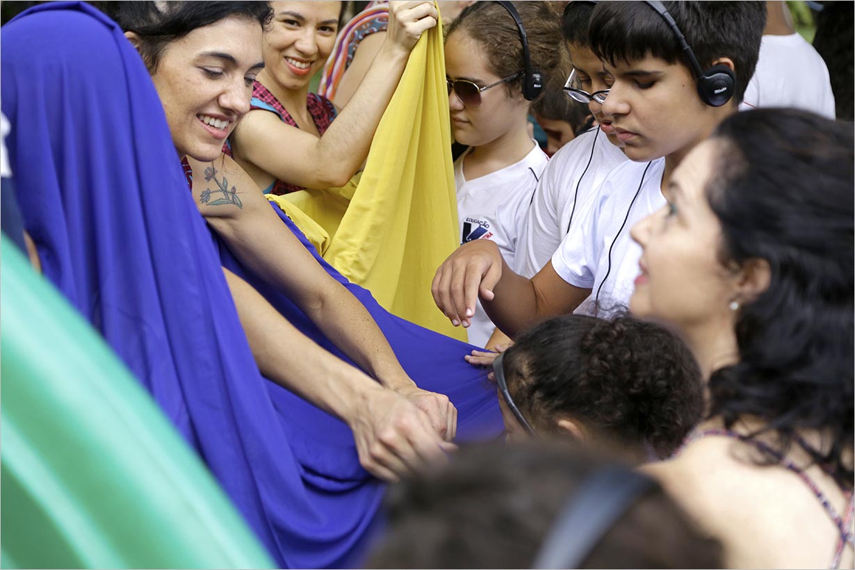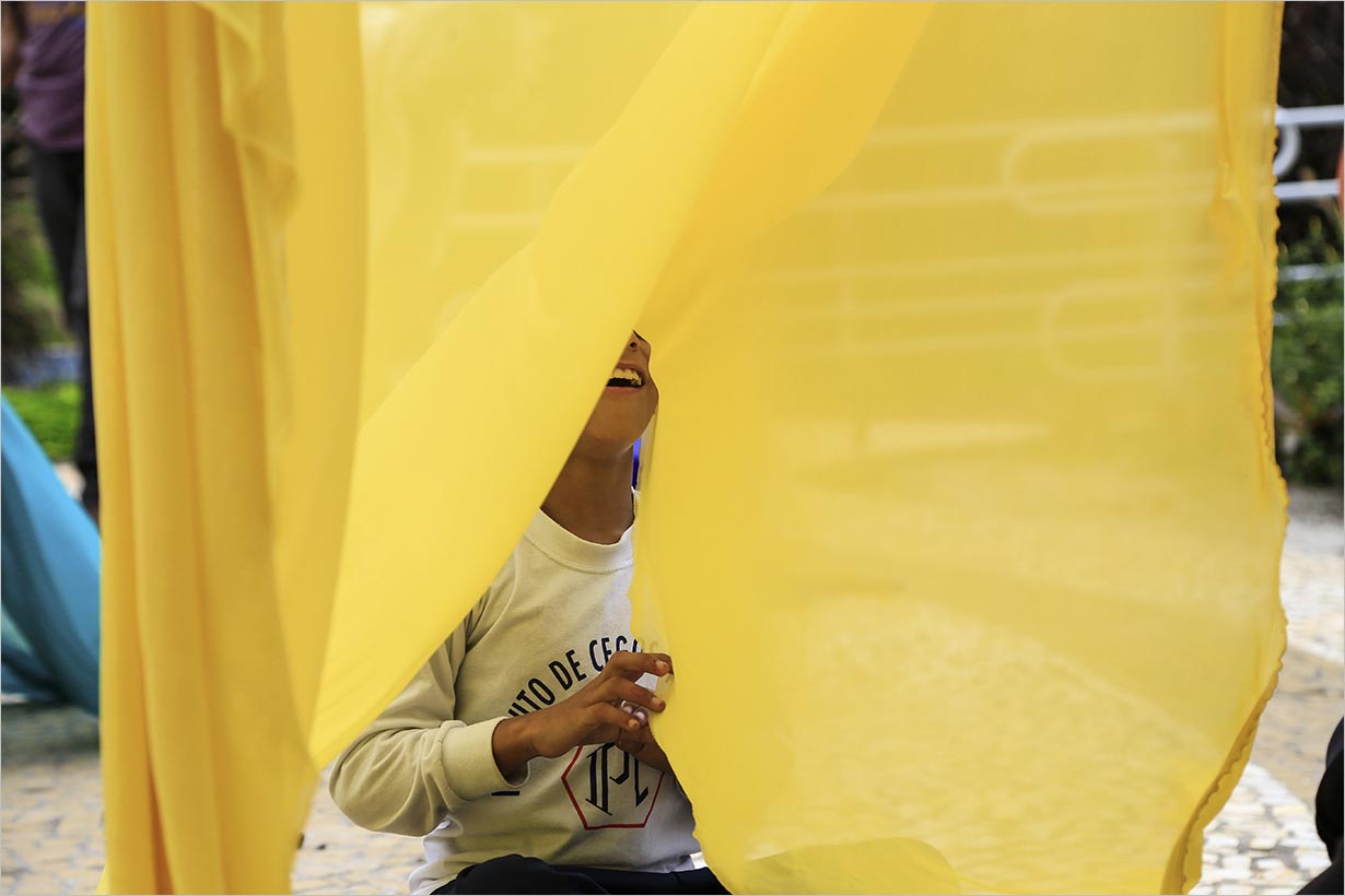 Os encontros com as crianças foram pensados diante das seguintes perguntas: como as crianças nos percebem? Como seus corpos reverberam em nossos encontros? Os conteúdos artístico-pedagógicos dos encontros estruturaram-se a partir das partituras dos núcleos dramatúrgicos da performance “Varal de nuvens”, que tem como proposição dialogar com o movimento do vento e convidar todos a criarem jogos em cantos imaginários, dançarem com tecidos em varais e contemplarem o movimento como se estivesse vendo as nuvens se transformando em figuras e bichos.