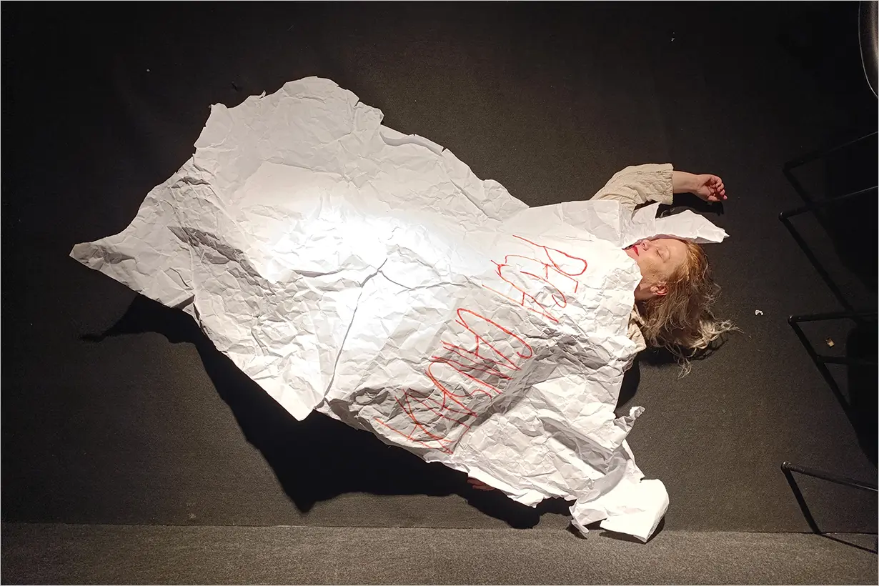 Outra presença marcante na montagem é o papel. A performer aparece envolta neles e, em cima de uma mesa, estão outros tantos que também estão cansados, como fotos, trabalhos de escola e até a Constituição, “a brasileira mais cansada”, como costuma dizer a atriz.