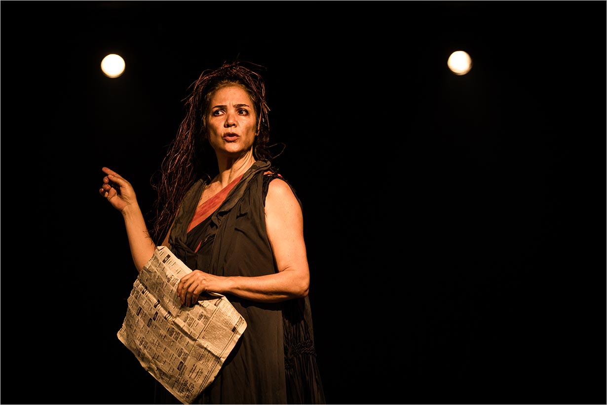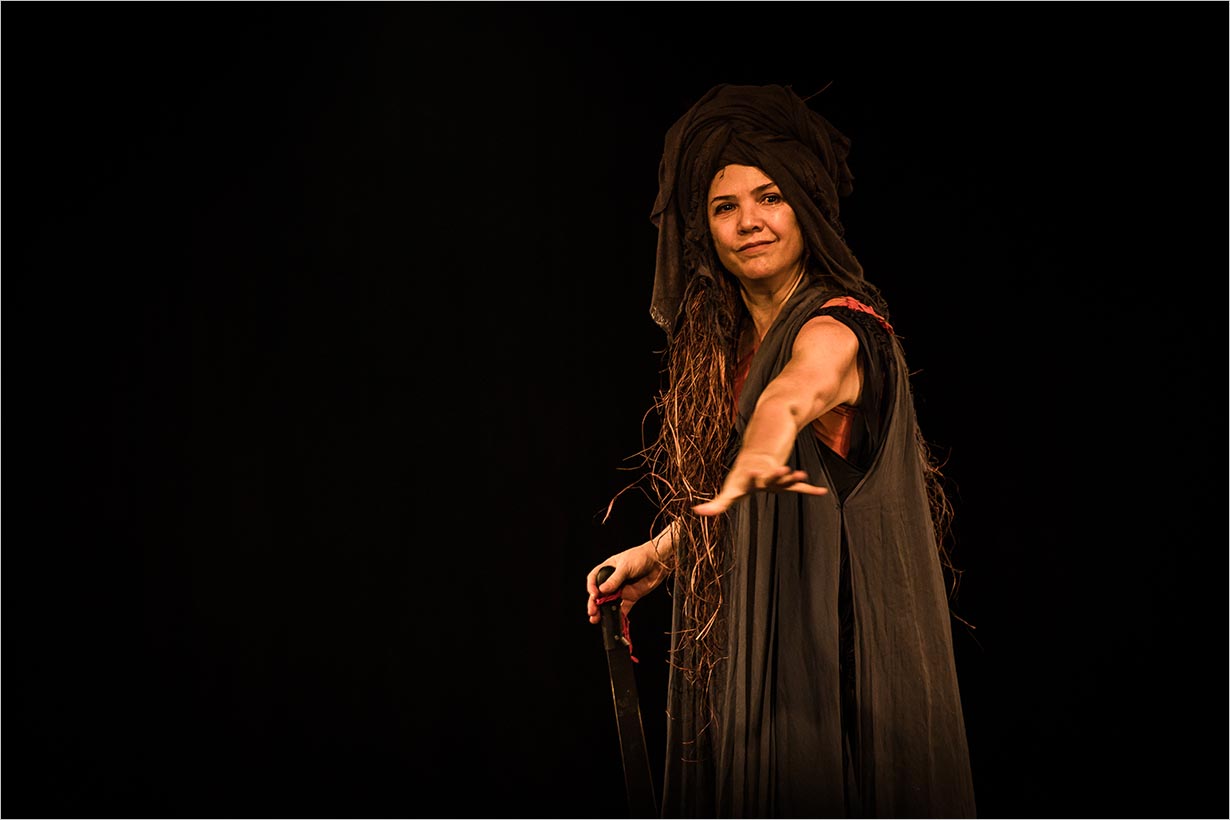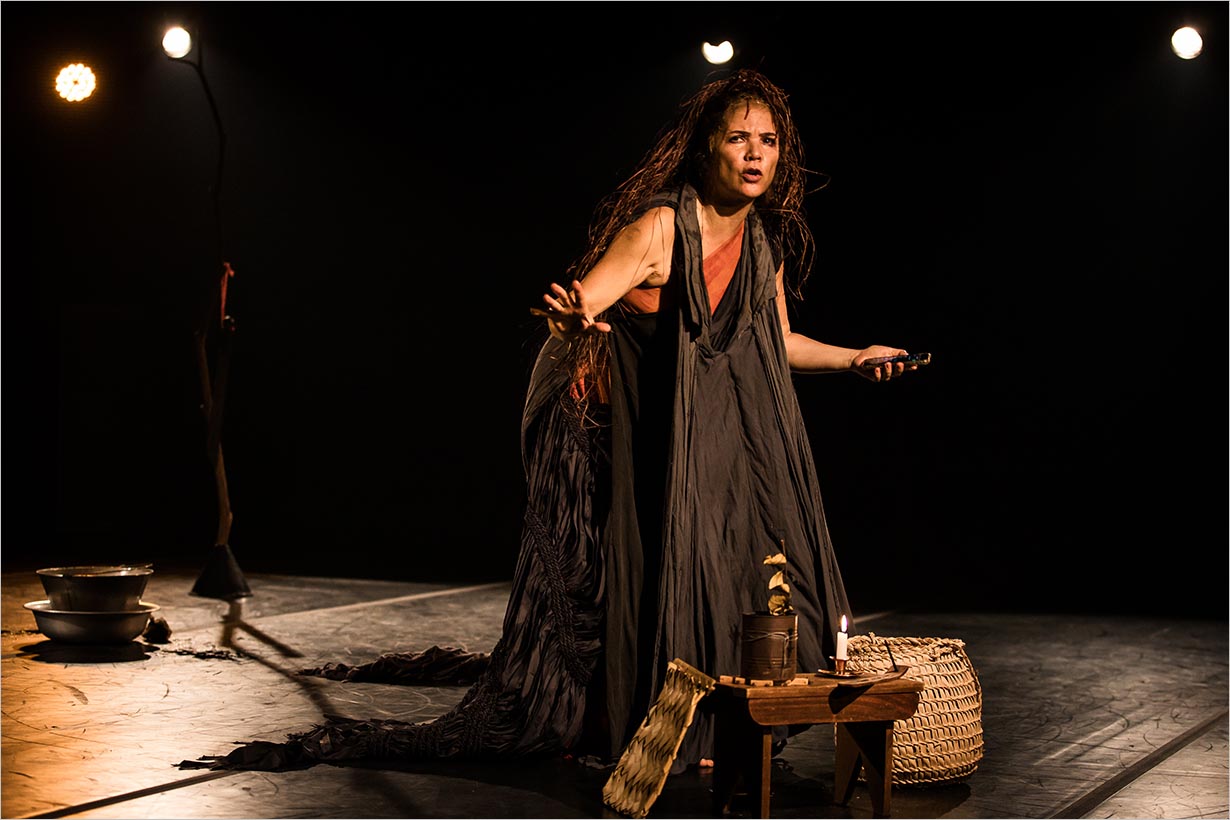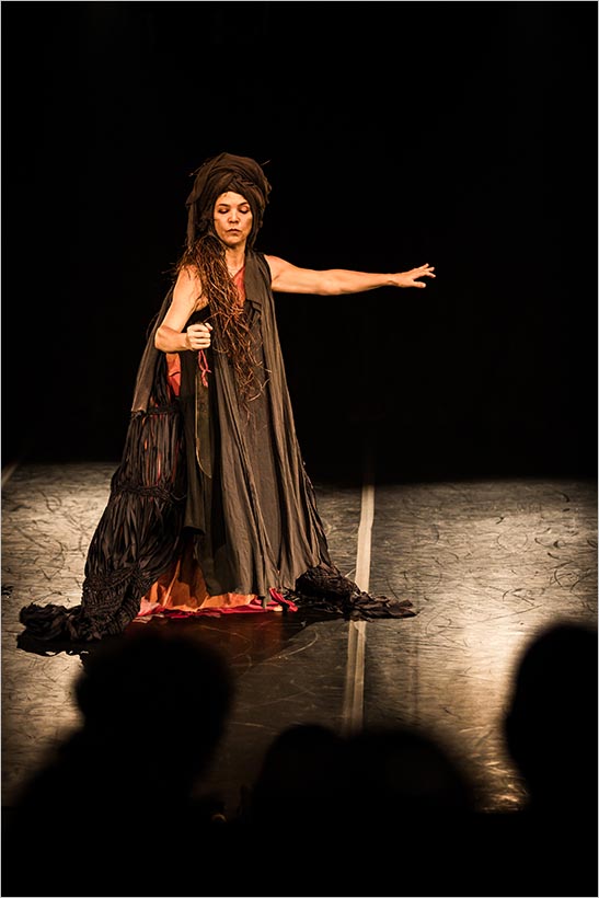 Pelas mãos dos múltiplos estados/vozes vividos pela atriz, tecidos, madeira, metais e outros materiais vão sendo continuamente ressignificados ao longo da apresentação.