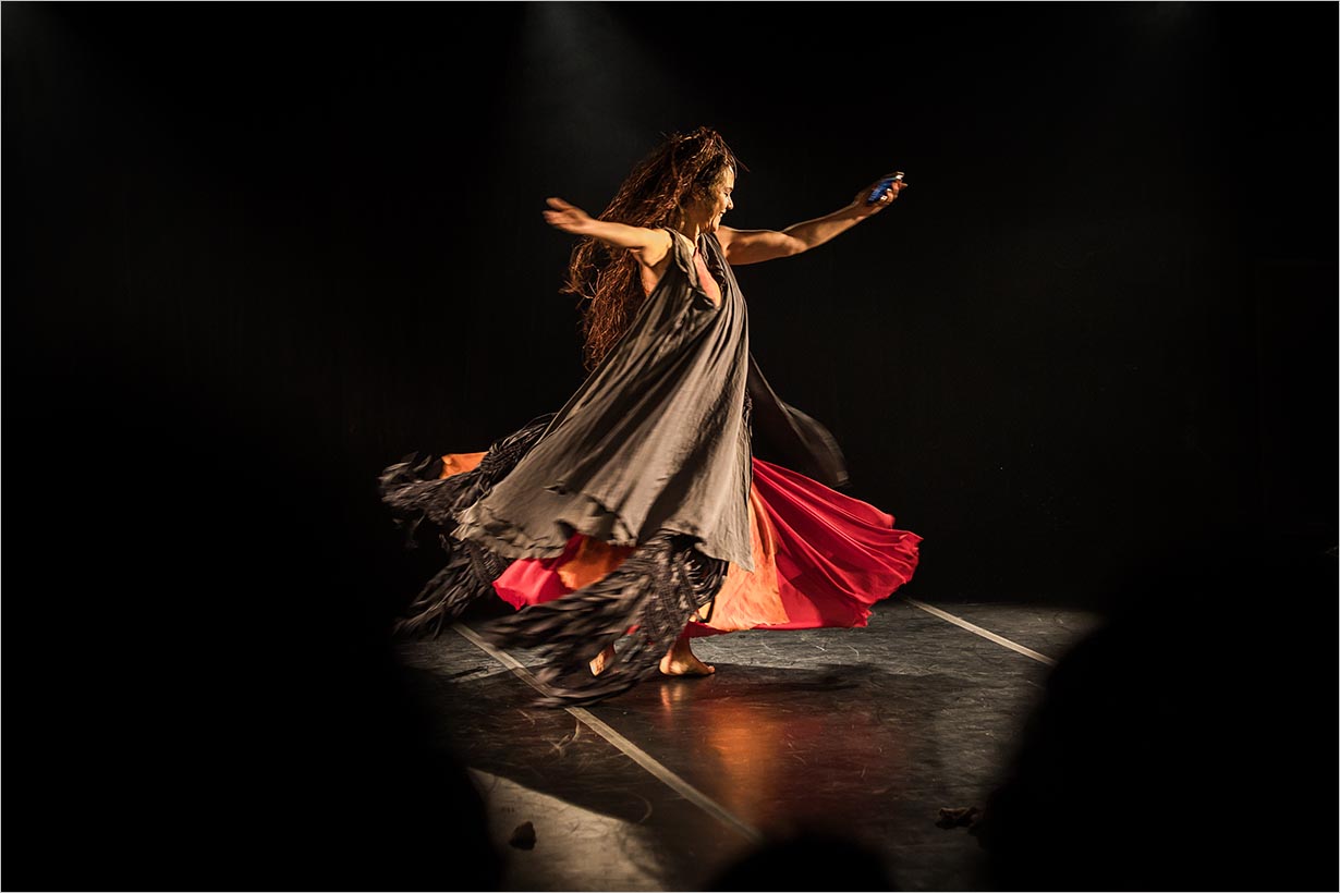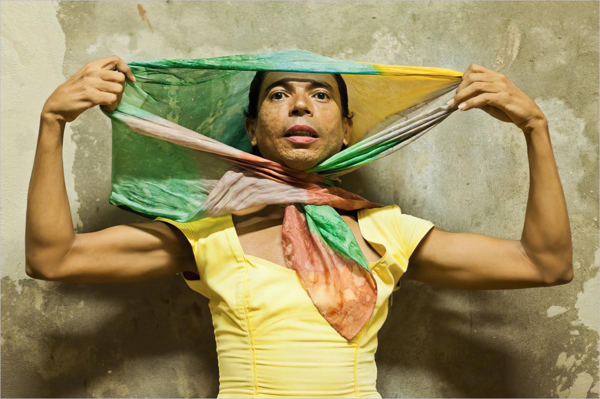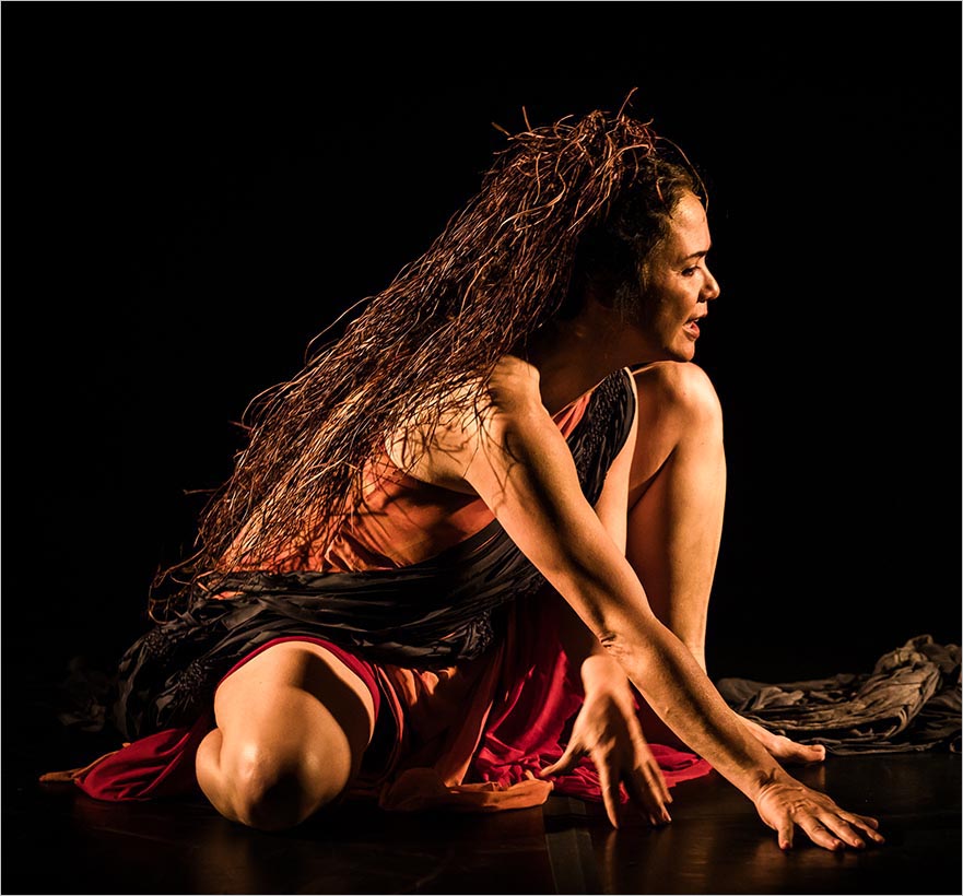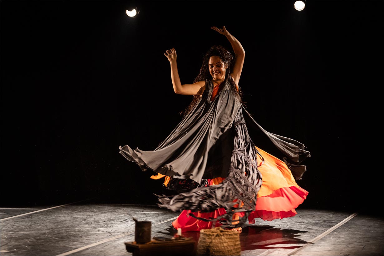 Pelas mãos dos múltiplos estados/vozes vividos pela atriz, tecidos, madeira, metais e outros materiais vão sendo continuamente ressignificados ao longo da apresentação.