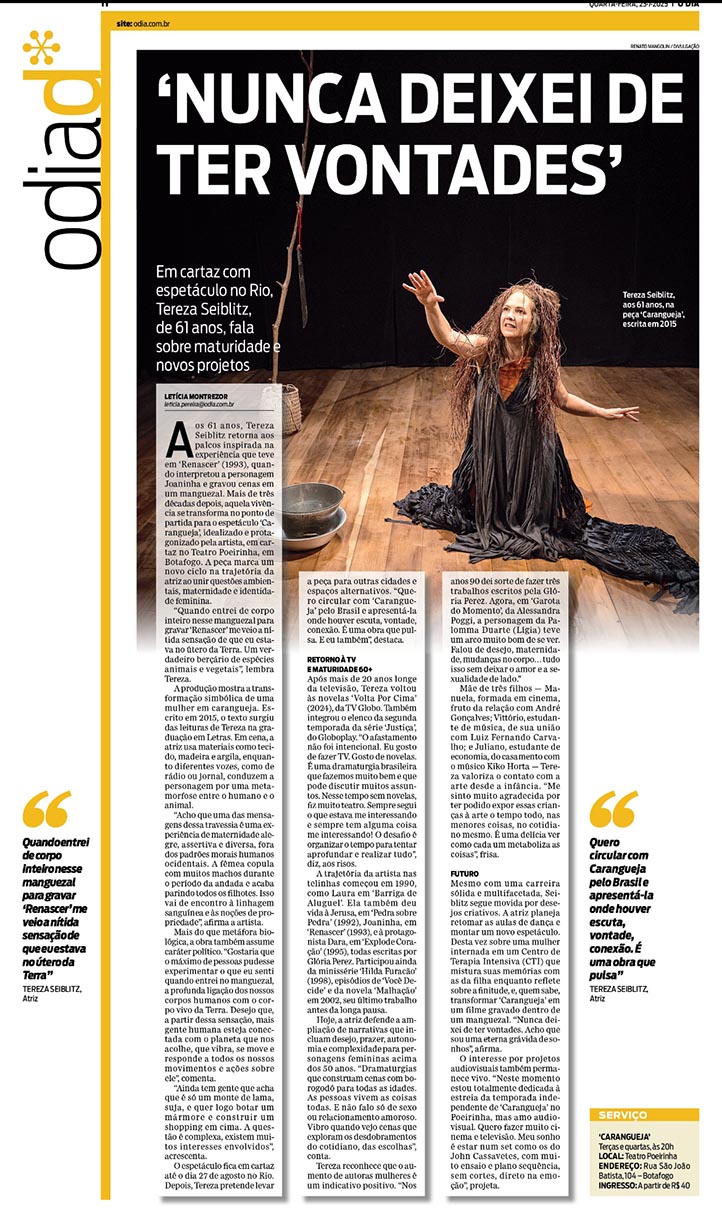 Já em 2024, integrou a mostra Movimentos de Solo, realizada no Teatro Domingos Oliveira e apresentada na Tenda do Design, na PUC-Rio. Na cidade de São Paulo, fez temporada no Sesc Ipiranga e passou pelo Teatro Oficina. Em Goiânia, foi apresentada no Teatro Sesc Centro.