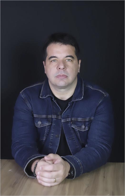 Homem sentado em uma mesa de madeira, olhando diretamente para a câmera com uma expressão séria. Ele veste uma jaqueta jeans azul sobre uma camisa preta e tem as mãos cruzadas à frente do corpo. O fundo é preto, destacando o rosto e a postura dele. Foto: João Pedro Ribeiro