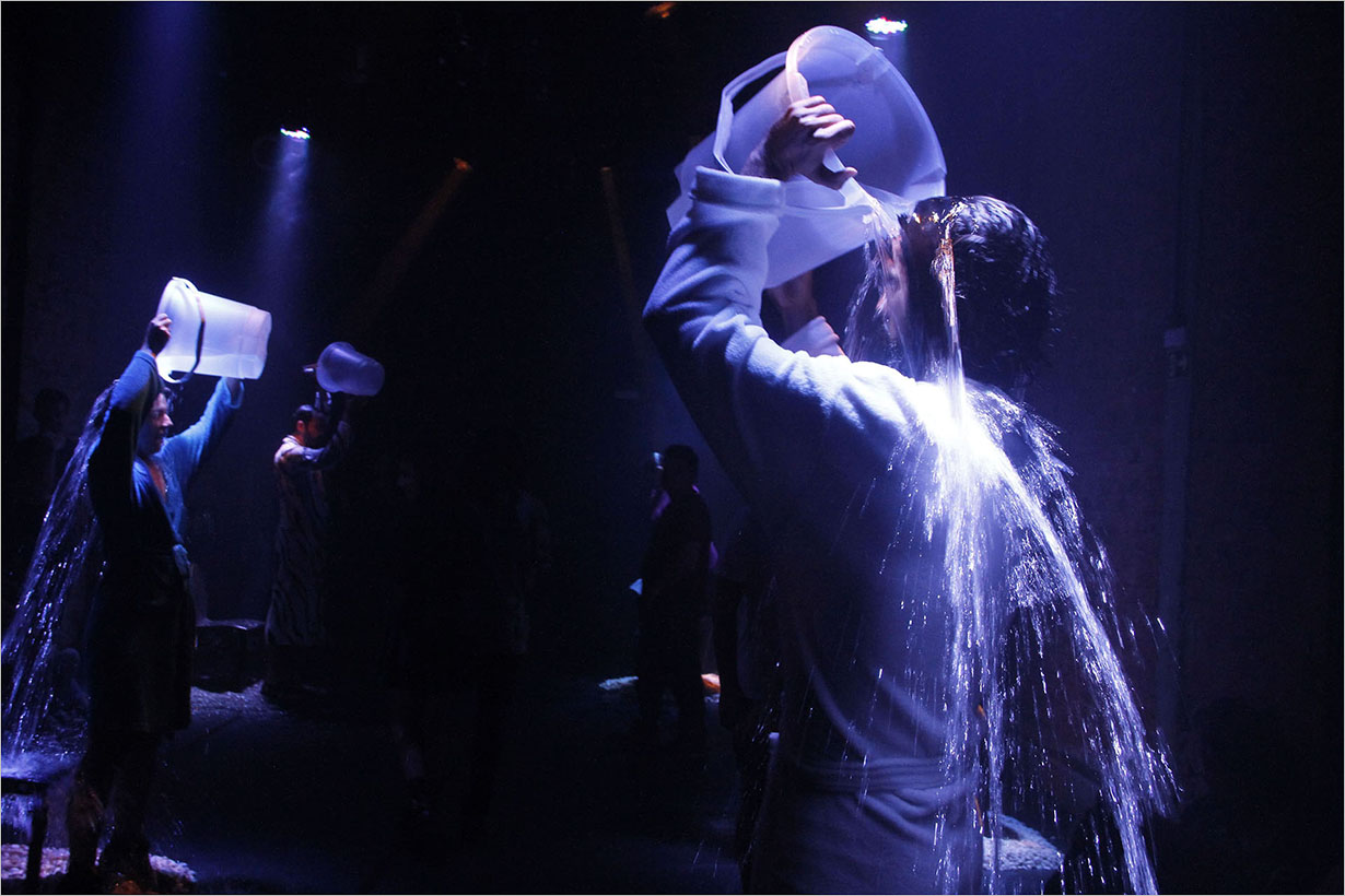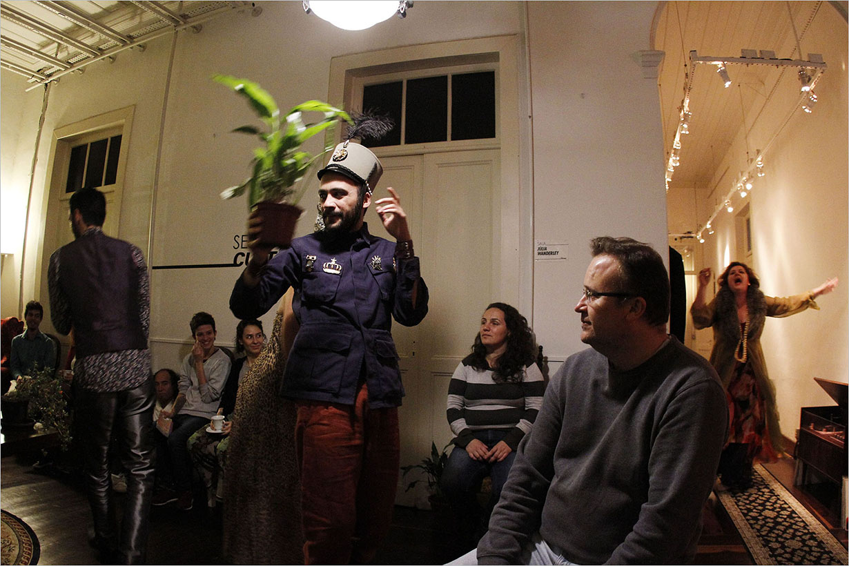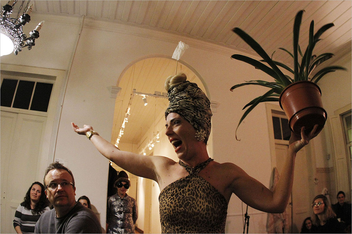A peça, com texto e direção de Sueli Araujo, acontece em dois ambientes simultaneamente, dividindo a platéia, mas mantendo uma conexão permanente entre os espaços e com “os públicos”. Em cena, ao invés de personagens tradicionais, os atores exploram vozes contraditórias, visões de mundo e formas de pensamento e conduta que tentam forjar uma atitude, construir um gesto que faça a diferença no mundo. Porém, são seres paralisados, medicados e em estado de absoluta suspensão. Em dissonância a este estado das coisas, a cena é revestida com diversos tipos de plantas, investindo na possibilidade de percepção da vida para além da quase morte e apatia das figuras da montagem.