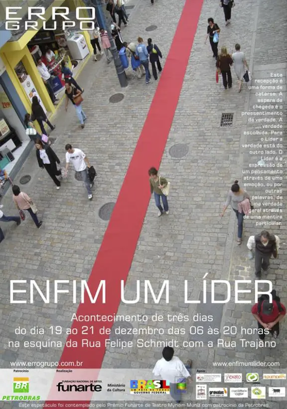 Enfim um Líder ultrapassa a fronteira do teatro e da arte para se transformar em um acontecimento nos centros urbanos em torno da expectativa e da chegada de um Líder. Com a obra, o ERRO Grupo dá continuidade à pesquisa de intervenção no cotidiano das pessoas, realizada desde 2001, ao voltar-se para uma grande ação na cidade que se dilui no espaço e tempo do ambiente urbano ao mesmo tempo em que o ocupa.