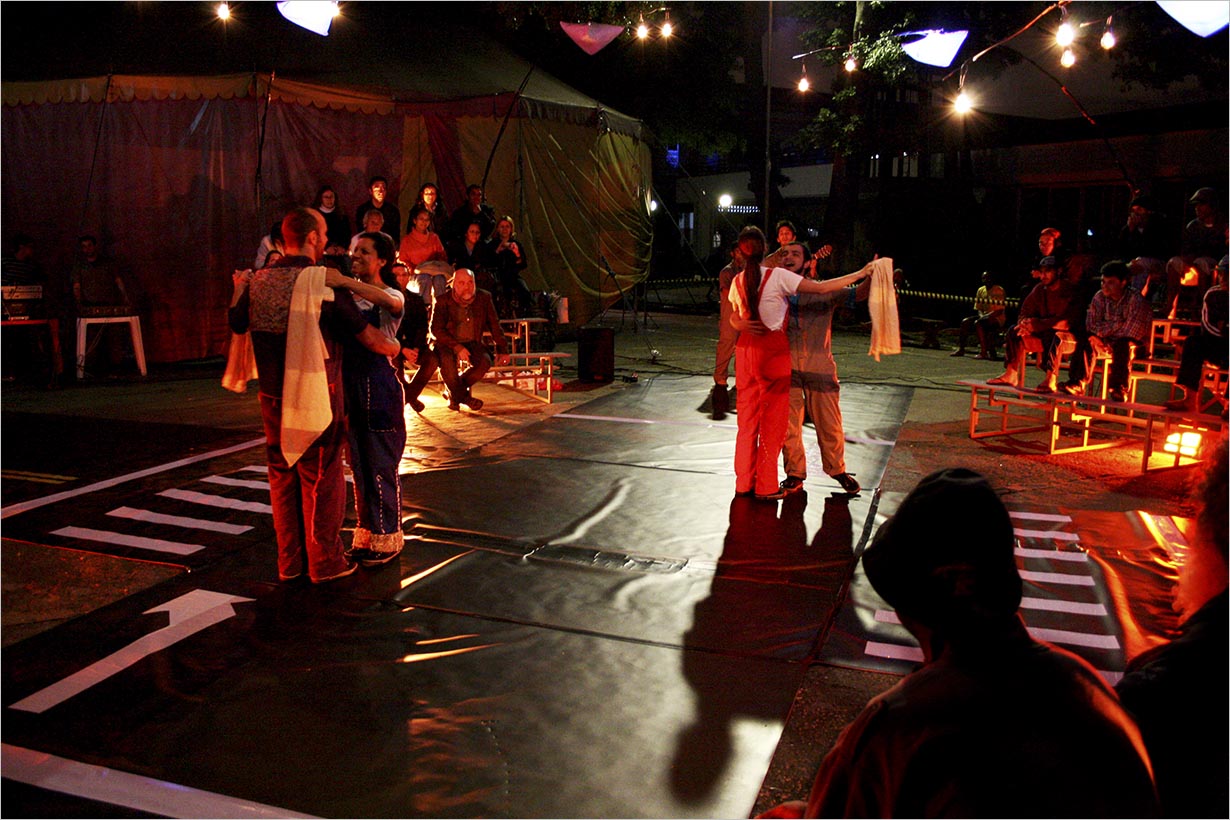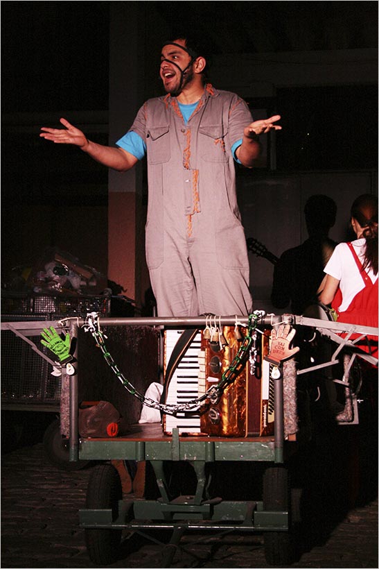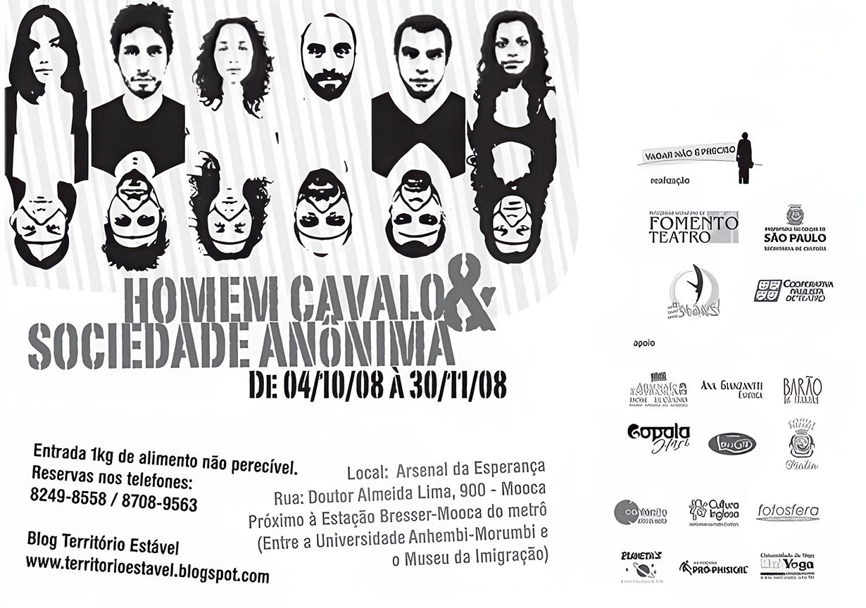 Homem Cavalo & Sociedade Anônima, de 2008, é resultado de um processo de pesquisa imersivo na realidade de homens albergados no Arsenal da Esperança, antiga Hospedaria dos Imigrantes, que na época da realização do espetáculo acolhia cerca de 1.500 desabrigados.