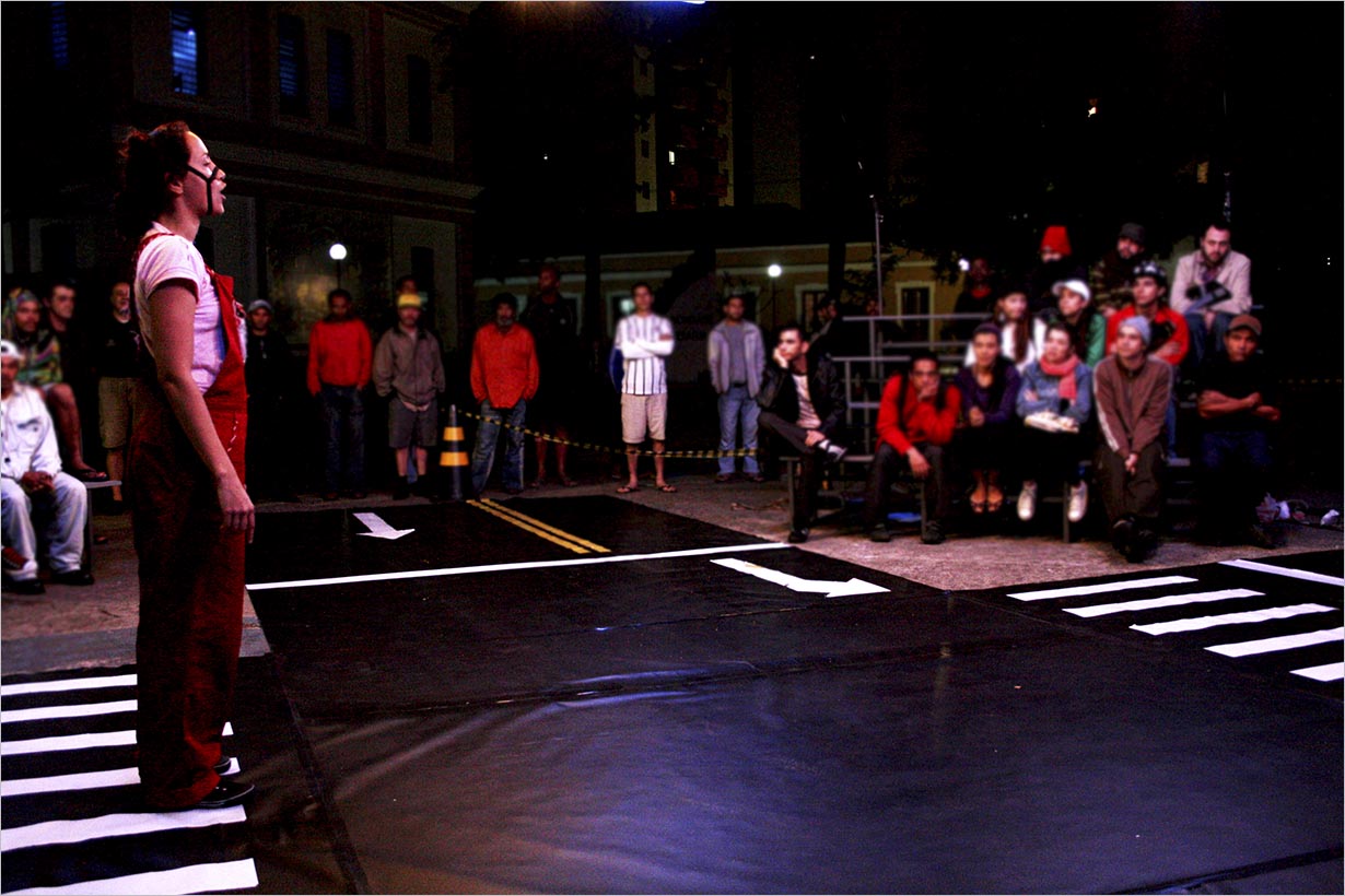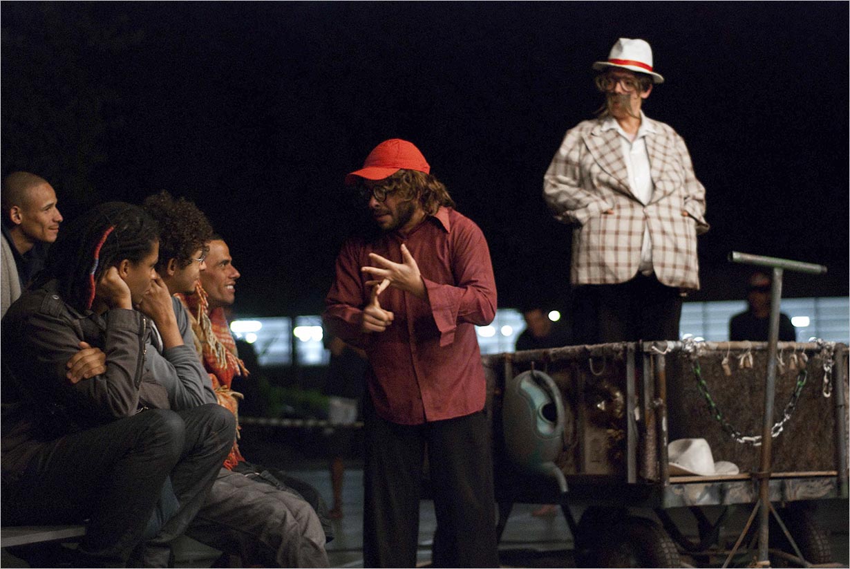 A dita “classe média” tem uma cena específica. Aí sim, conforme Ionesco, a brutalização sem volta, a estupidez dos desejos fetichizados de modo a converter as personagens em seres cegos, mediando a vida por aparelhos telefônicos e protegendo-se do mundo real. Desfilam ainda: moradores de rua, bêbados, loucos, desesperados, aleijados, bandidos colocados em relação, não com a Lombroziana concepção fenotípica, ou fardo, ou sina, ou destino, mas com a complexa relação de tecidos sociais e formas de produção da vida capazes de submeter pessoas a papéis escolhidos conforme as circunstâncias.