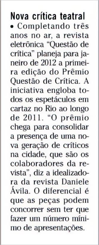 A Questão de Crítica – Revista eletrônica de críticas e estudos teatrais foi criada no Rio de Janeiro em março de 2008. Idealizada por Daniele Avila Small, editora da revista desde então, o projeto veio propor uma mudança na cultura da crítica de teatro do Rio de Janeiro naquele momento, contrapondo-se à visão predominante da crítica jornalística na cidade, com uma abordagem mais reflexiva sobre a crítica e sobre o teatro. Ao longo dos anos, a revista desenvolveu projetos como o Encontro Questão de Crítica, o Prêmio Questão de Crítica e o Prêmio Yan Michalski. Com o Complexo Duplo, a Questão de Crítica realiza a Complexo Sul – Plataforma de Intercâmbio Internacional, desde 2018. Em 2023, por ocasião da comemoração dos 15 anos e pelas atividades realizadas durante a pandemia, a revista foi indicada ao Prêmio Shell de Teatro.