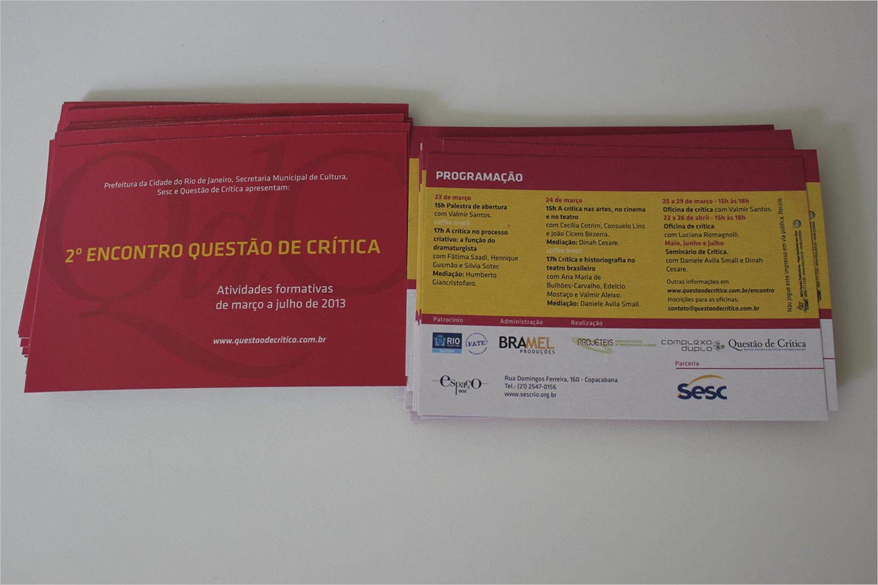 Em 2013, com patrocínio do FATE e apoio do SESC Rio, o 2º Encontro Questão de Crítica foi realizado no Espaço Sesc, em Copacabana, trazendo Valmir Santos para ministrar uma oficina e oferecendo um seminário de história da crítica no Rio de Janeiro com Daniele Avila Small e Dinah Cesare, além dos debates com pesquisadores de teatro, história, dança e cinema.