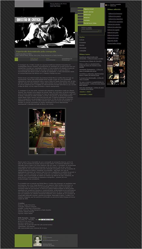 Com a colaboração de pesquisadores de teoria do teatro e artistas da cena, a revista publicava edições mensais em um primeiro momento, com textos divididos em cinco seções: críticas, estudos, conversas, processos e traduções. Em meados de 2009, um hacker invadiu a revista e deletou todo o conteúdo publicado, revelando a insegurança do site criado em 2008. Em 2010, com um novo site e nova identidade visual, a revista retornou, com quase todo o conteúdo das primeiras edições recuperado e fôlego renovado para retomar as edições mensais.