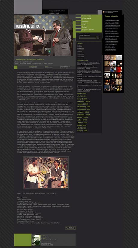 Na época em que a revista foi idealizada, havia pelo menos cinco jornais impressos que publicavam críticas de teatro regularmente no Rio, alguns blogs e sites que publicavam críticas de diferentes áreas das artes. No entanto, a noção de crítica de teatro que predominava na cidade era amplamente determinada pelo jornal O Globo e ditava não apenas um pensamento conservador e mercantilizado sobre teatro, mas também uma forma engessada e empobrecida de escrita da crítica. Contra esse estado de coisas, a Questão de Crítica se colocou na cidade como alternativa de pensamento e conversação, alimentada pelo desejo de estabelecer conexões entre a pesquisa de linguagem da cena contemporânea e os estudos da teoria do teatro.