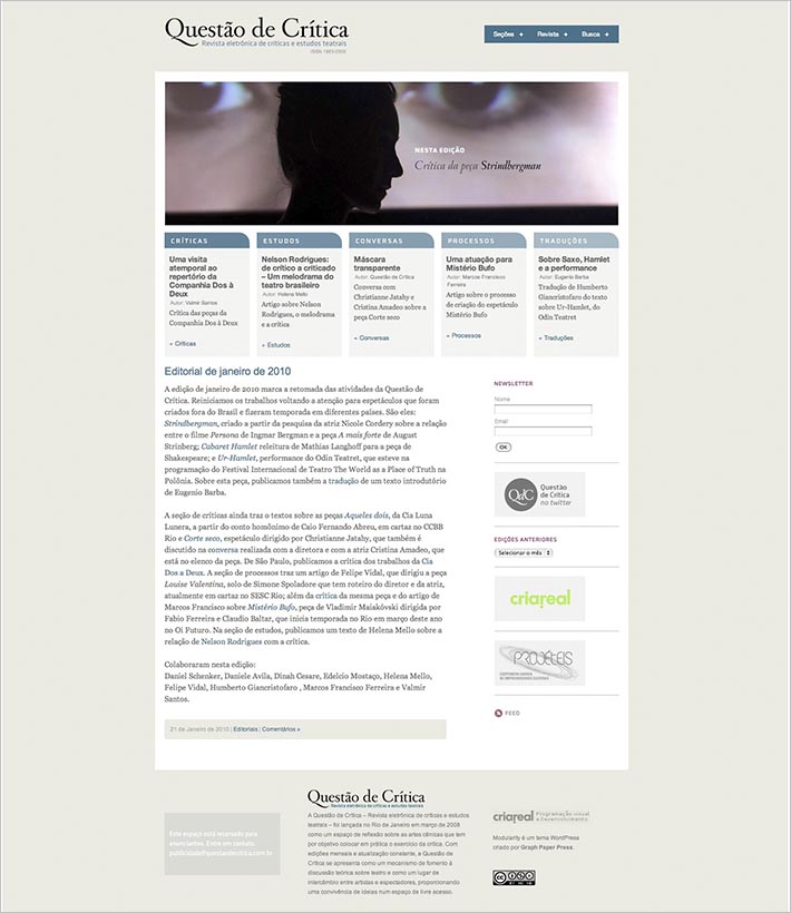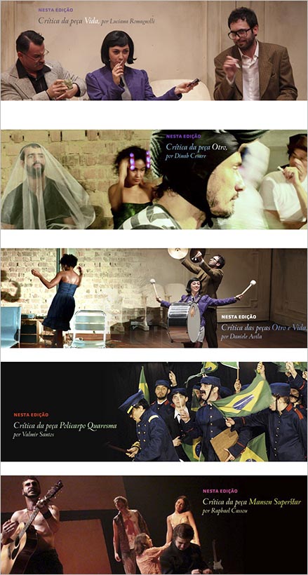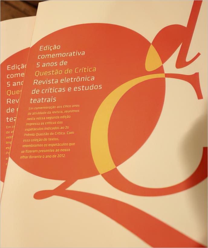 Por um breve momento, entre 2012 e 2013, tentamos realizar publicações impressas em parceria com a Editora Multifoco, mas o projeto não foi adiante. Nesse ínterim, publicamos dois livros com uma seleção de críticas das peças indicadas ao Prêmio Questão de Crítica – as edições comemorativas de 4 e 5 anos da revista – e três livros com dramaturgias: O outro lado e É só uma formalidade, duas peças do grupo Quatroloscinco, de Belo Horizonte; Outside de Pedro Kosovski; Breu de Pedro Brício.