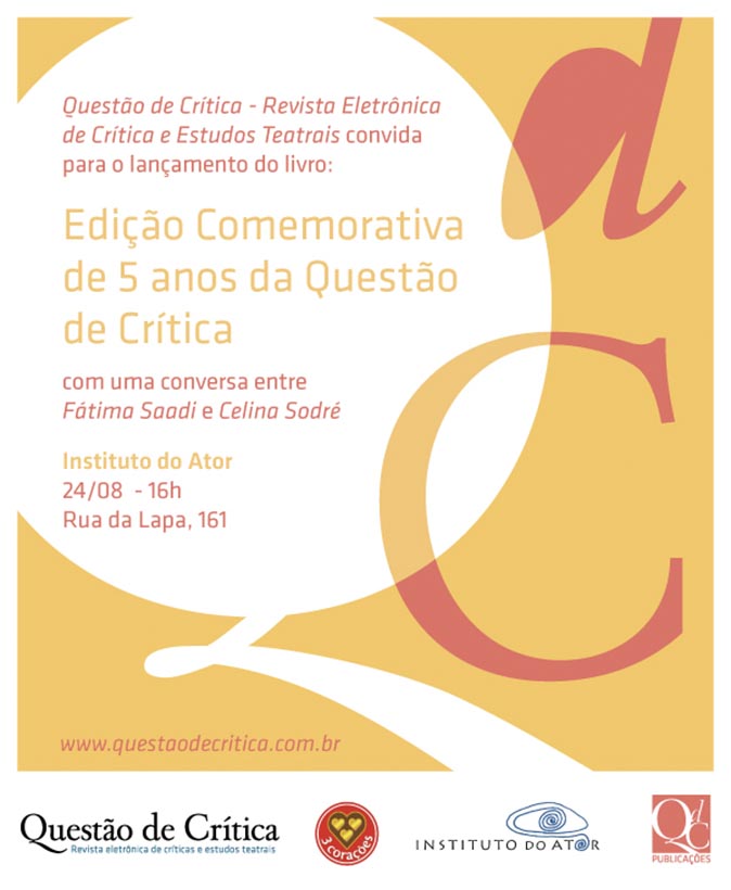 Uma afetuosa comemoração foi feita no Espaço Cultural Sérgio Porto, reunindo breves apresentações de artistas, como se fosse um CEP 20.000 da Questão de Crítica. Participaram com cenas e intervenções: Tatiana Henrique e o elenco de Nuang, Cecilia Ripoll e Julia Pastore com um trecho de Pança, Mauricio Lima com Arqueologias do Futuro e na companhia de Maria Lucas representando a plataforma Pandêmica, Lucas Gouvêa e Felipe Vidal com Dois Mundos, Larissa Siqueira com Reencarnação Ao Vivo, a Cia Marginal, com Jaqueline Andrade e Vanu Rodrigues, além de Natasha Corbelino (com texto sobre a curadoria do Midrash feita com Vilma Melo), Adriana Schneider (com o livro Janelas abertas, organizado por ela e Eleonora Fabião), Leandro Fazolla (pelo canal Cadernos Cênicos) e na companhia de Rohan Baruck e Vinicius Baião com o livro Veredas Fluminenses – Pequenas Cenas de Independência.