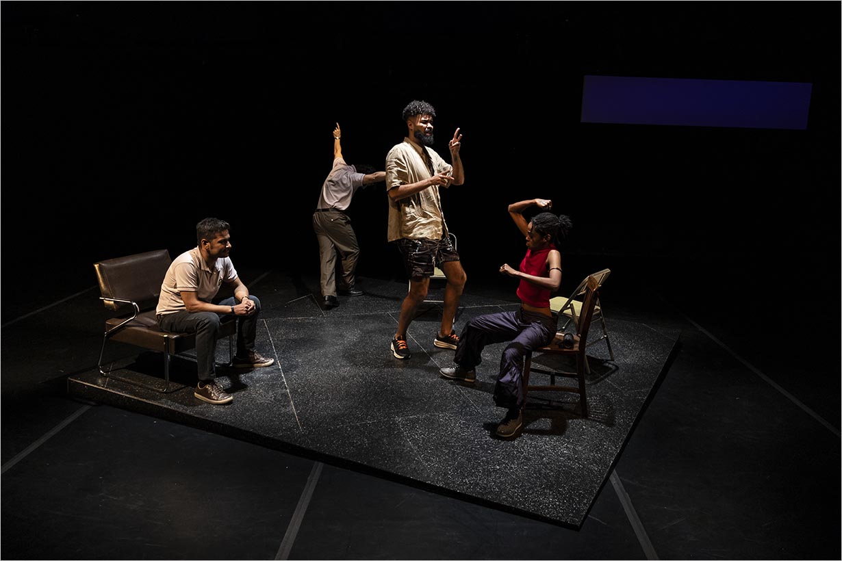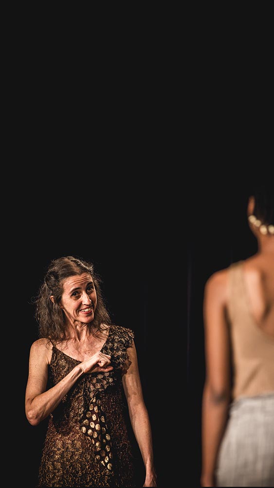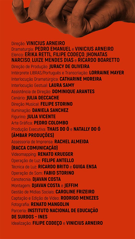 A peça coloca em cena uma criação poética em que a cultura surda e a cultura ouvinte estão entrelaçadas. Assim, o espetáculo se endereça tanto à comunidade surda quanto ao público ouvinte. Há lacunas para ambos os públicos, mas elas estão lá porque fazem parte das relações complexas, das conversas mais importantes, da expressão daquilo que não encontra tradução possível em nenhuma linguagem. Como se diz o que não se sabe dizer? A peça abre espaço para outras formas de expressão e interação que desistem de (ou simplesmente dispensam!) palavras e sinais. O cumprimento entre os personagens de Ricardo Boaretto e Filipe Codeço é um exemplo disso. A atuação dançada de Erika Rettl expressa a personagem e os afetos que a atravessam tanto quanto o que ela diz ou o que é dito sobre ela. Quando Jhonathas Narciso e Luize Mendes Dias interpretam uma canção, pode ser que o movimento, que faz os sinais tomarem a expressão do corpo todo, seja mais contagiante que a música. O momento de referência a uma coreografia de Pina Bausch proporciona mais uma camada de explosão: não são só os afetos mais angustiantes que são difíceis de traduzir, a alegria também pode escapar à formalização da linguagem que se esforça por fazer sentido.