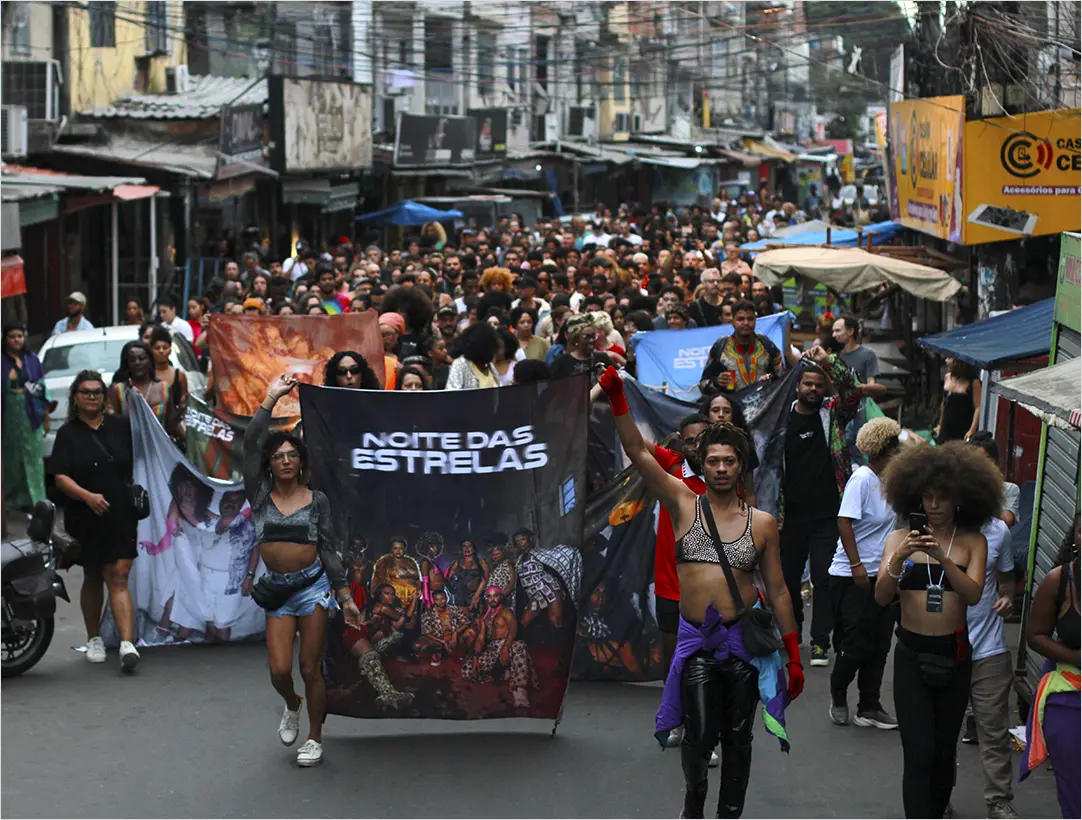 Entendo que um fluxo desse movimento é o lugar onde a Entidade Maré propõe o espetáculo-happening A noite das estrelas, uma celebração única LGBTQIAPN+, realizada no Complexo de favelas da Maré, particularmente na Nova Holanda, para celebrar a vida e a obra de artistas que se destacaram dentro da comunidade nos anos 80 e 90 do século XX.