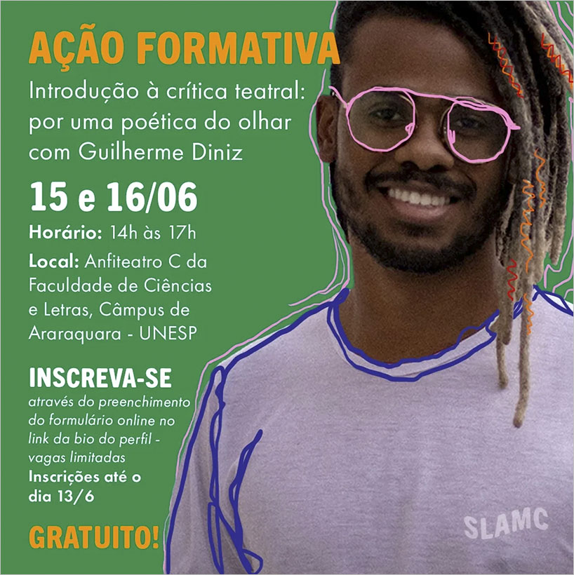 Guilherme Diniz também ministra cursos livres ligados ao ensino da crítica teatral e à história do teatros negros no Brasil.