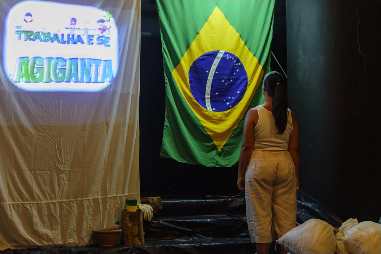 Um espetáculo sobre nós, dirigido a nós, os brasileiros que não se consideram índios. Entrelaçando narrativas vivenciadas em terras indígenas Kanhgág e Mbyá Guarani, notícias jornalísticas, dados históricos, palavras de pensadores indígenas contemporâneos, além de memórias sobre sua origem indígena, Ana Luiza da Silva apresenta um olhar crítico sobre esse Brasil parido à força, inventado a partir das dores de mulheres pegas no laço. Um espetáculo sobre um país que “vai pra frente”…