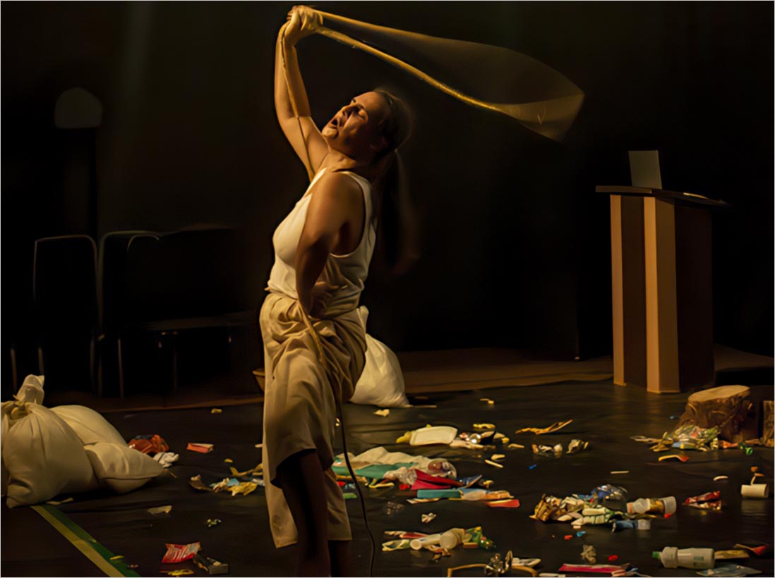 Na cena, a linguagem artística se destaca pela fusão de teatro físico e elementos multimídia, criando uma experiência sensorial e provocativa. Projeções visuais e referências ritualísticas dialogam com a cultura popular, especialmente com matrizes afro-brasileiras e indígenas, enquanto o corpo da performer torna-se um território de resistência e memória. A encenação experimental rompe com formatos tradicionais, utilizando a fragmentação e a poesia visual para traduzir conflitos entre o individual e o coletivo.