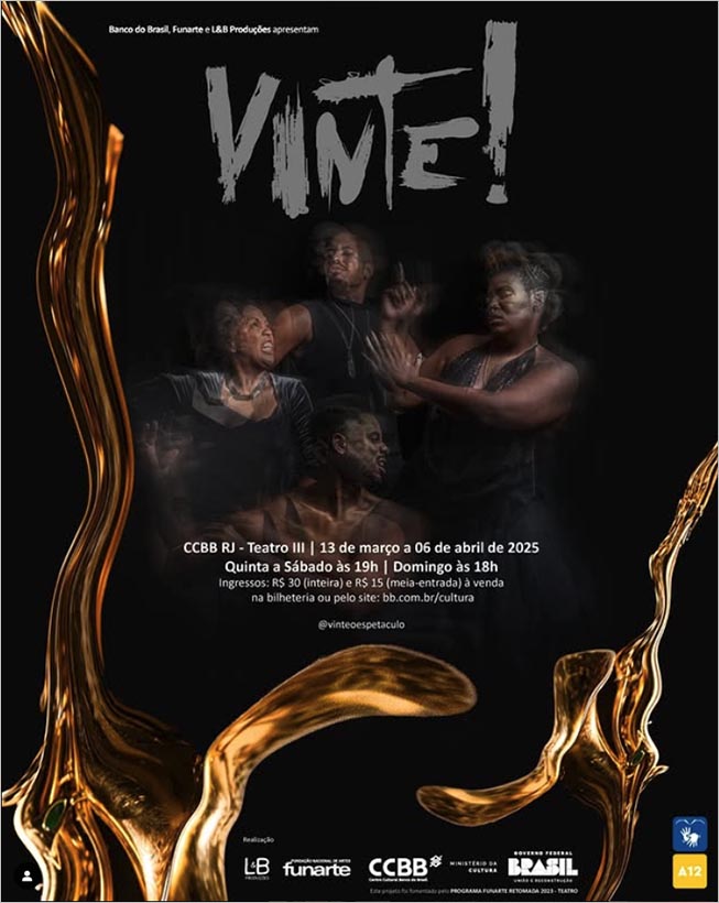 A fusão entre teatro, dança e música dá o tom de Vinte!, espetáculo escrito por Tainah Longras e dirigido por Mauricio Lima, que estreiou no Centro Cultural Banco do Brasil Rio de Janeiro (CCBB RJ) em 13 de março de 2025.